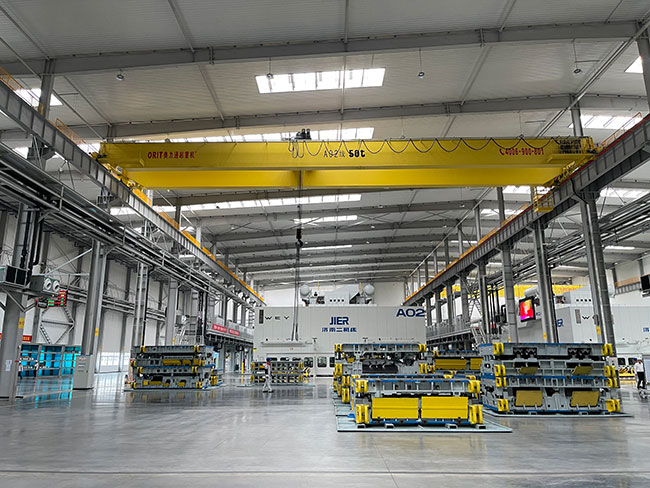奧力通起重機(jī)為揚(yáng)力集團(tuán)沖壓機(jī)床產(chǎn)品量身定制多鉤協(xié)同、重載大斜拉起重機(jī),即“重型機(jī)床翻轉(zhuǎn)專用起重機(jī)”,采用世界上最先進(jìn)的“多購協(xié)同、大斜拉”獨到設(shè)計,全車采用PLC控制、全變頻調(diào)速、并配置故障自診斷和安全監(jiān)控功能,先進(jìn)的技術(shù)確保客戶床身翻轉(zhuǎn)穩(wěn)穩(wěn)當(dāng)當(dāng)、安安全全!該起重機(jī)應(yīng)用于揚(yáng)力集團(tuán)的智能汽車沖壓線生產(chǎn)制造車間。