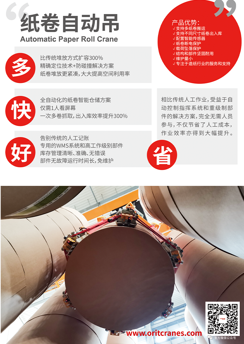 奧力通起重機致力于為造紙行業提供高效、智能的物料搬運解決方案,本次展會將重點展示以下優勢: