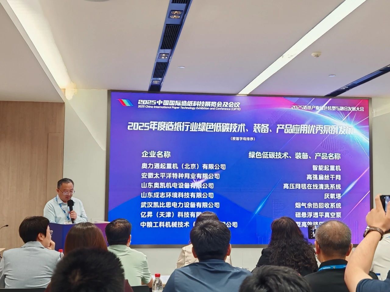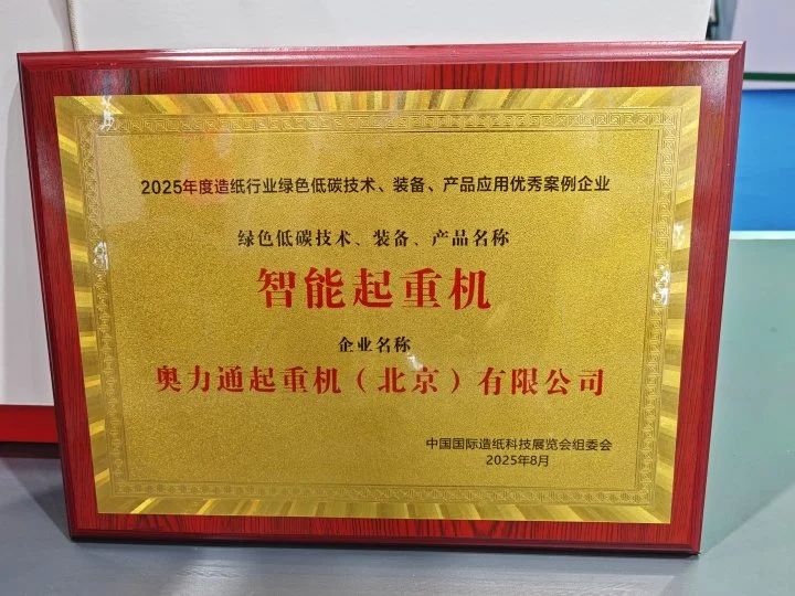 8月13日,在中國造紙協會及中國制漿造紙研究院主辦的造紙產業綠色轉型與融合發展大會上,奧力通紙廠智能起重機憑借其在綠色低碳技術與智能裝備領域的卓越表現,為奧力通起重機贏得“2025年度造紙行業綠色低碳技術、裝備、產品應用優秀企業”稱號。