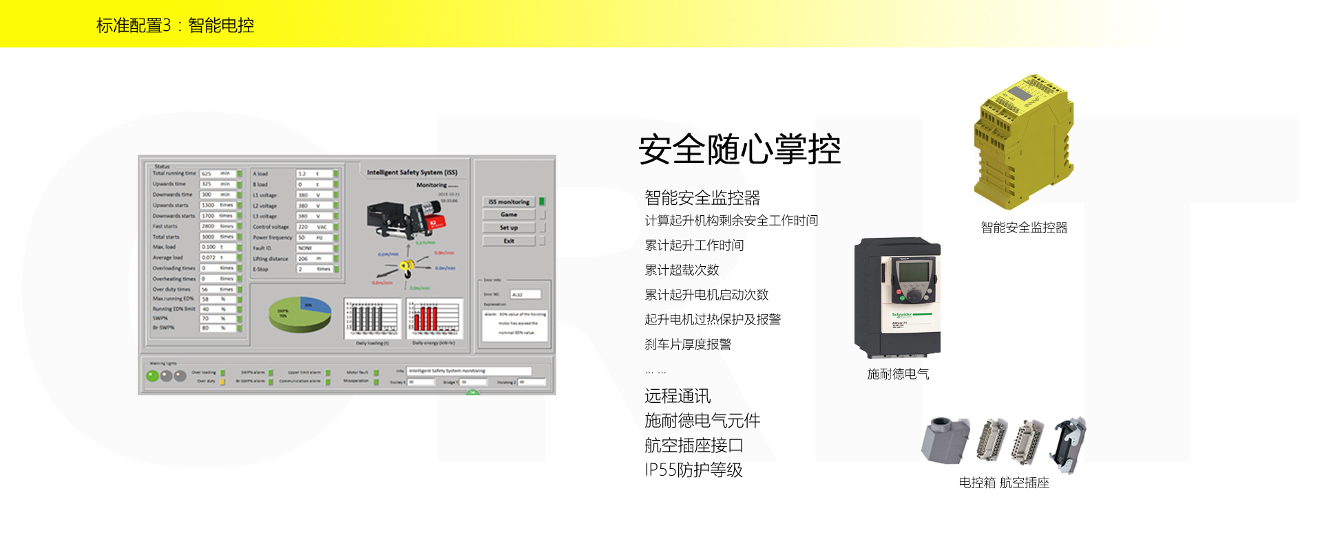 產品名稱:半門式起重機 優化設計,結構緊湊 變頻控制,運行平穩 實時安全監控,確保吊運安全 龍門吊專用C型驅動,節約空間 平軌設計,地面無障礙 美觀大方,視野開闊,便于物流 標準化配置,讓性能無比穩定 適用于12.5t以下額定載荷 標準配置1:起升機構 顛覆傳統,自成一體 低凈空設計 柔性驅動,內應力小,傳動效率高 重級制電機,接電持續率60%ED 行走變頻無極調速,運行平穩 自調試電磁盤式制動器,可靠,防塵 2160N/mm2 高強度鍍鋅鋼絲繩,免維護 全周型導繩器,防松繩 全系標配安全監控系統 標準配置2:三合一驅動 靜音科技,靜享搬運 結構緊湊,鋁合金殼體,密封 變頻電機+硬齒面減速箱+盤式制動器 龍門專用C型三合一集成化設計,節約空間 全變頻調速 最高轉速4800 r/min 防護等級IP55 半油脂潤滑,免維護 靜音科技,靜享搬運 標準配置3:電控系統 安全隨心掌控 智能安全監控器 計算起升機構剩余安全工作時間 累計起升工作時間 累計超載次數 累計起升電機啟動次數 起升電機過熱保護及報警 剎車片厚度報警 ... ... 遠程通訊 施耐德電氣元件 航空插座接口 IP55防護等級 標準配置4:端梁 多變靈活,適應自如 模塊化直驅設計 自重輕、體積小 多種連接方式,安裝尺寸靈活 適用各種廠房,降低廠房高度 QT700車輪,自潤滑,更靜音 采用調心軸承,適應更自如 獨特的平軌設計,地面無死角,物流無障礙 平軌半門式起重機,工業設計的匠心所在